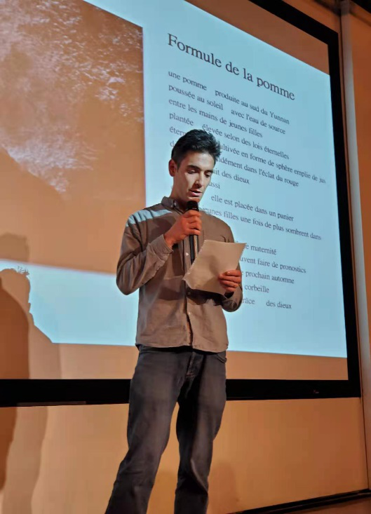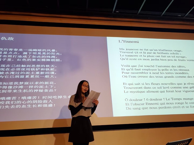 在纪念波德莱尔专场中,舒凌鸿副教授对波德莱尔的生平和代表作品,以及他对中国诗人与诗歌的影响进行了精彩阐述。诗人于坚先生与大家分享了他自己以波德莱尔为题创作的诗歌。另外,昆明法盟外教玛丽(Marie)老师,旅居昆明的法国诗歌爱好者雅米拉(Jamila)女士,以及两位新葡的京集团3522法语语言文学硕士研究生代表赖灿杰和吴怡分别用法语朗诵多首以“渴望”为题的波德莱尔诗歌。值得一提的是,吴怡同学成功入围3月中旬举办的第五届法语诗歌翻译大赛西南区半决赛。