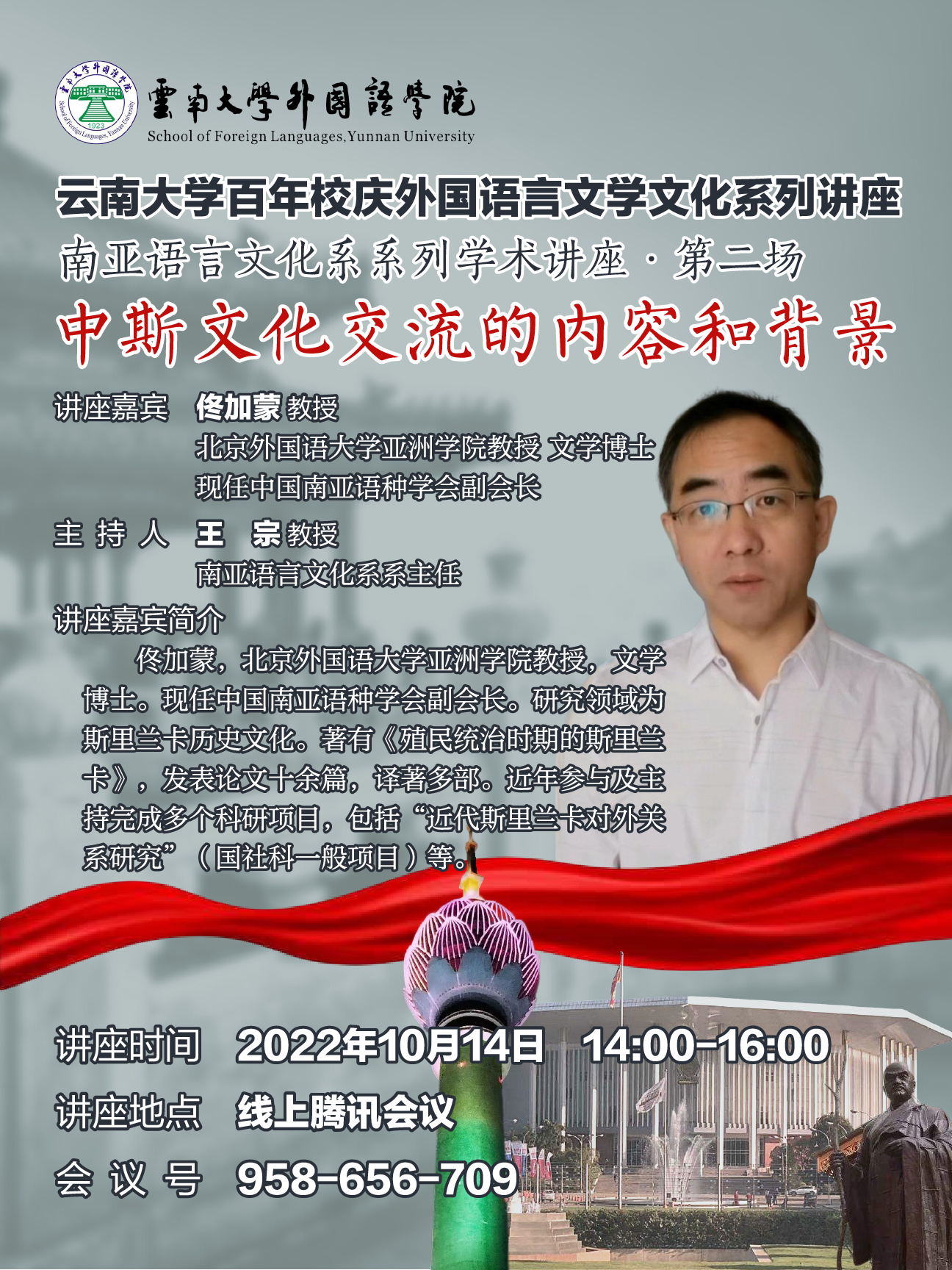 2022年10月14日下午两点,北京外国语大学亚洲学院教授、现任中国南亚语种学会副会长佟加蒙为我院师生做了题为“中斯文化交流的内容和背景”的学术讲座。